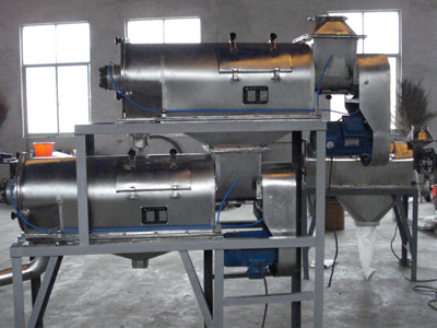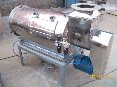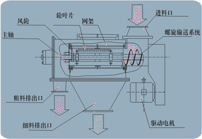 本設備篩網為圓筒狀,置于機體內,物料通過螺旋輸送系統(tǒng)后,和氣流混合、霧化進入網筒內;通過網筒內風輪葉片使物料同時受離心力和旋風推進力,從而迫使物料噴射過網,由細料排出口排出,不能過網的物料沿筒壁從粗料排出口排出。